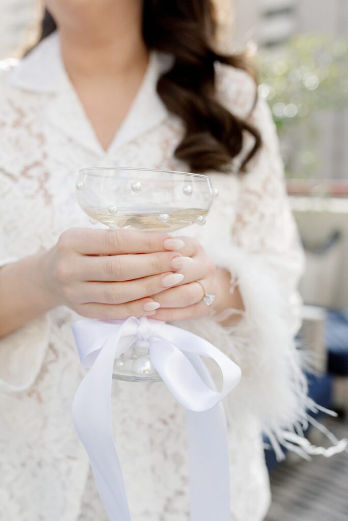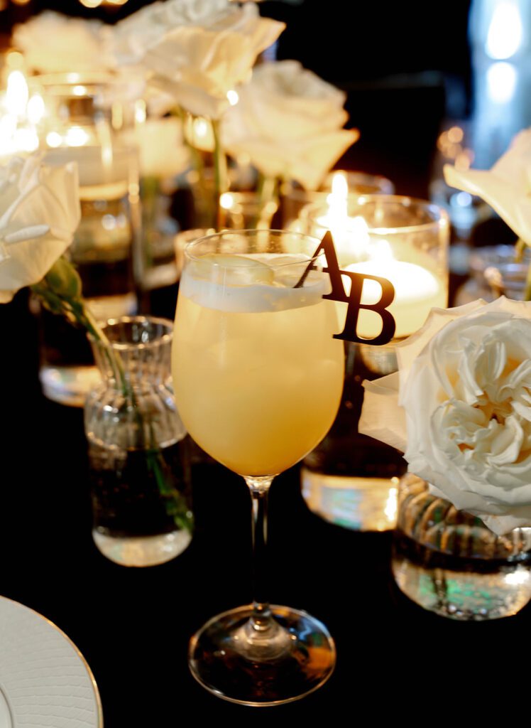 Every element of Ashley and Blake’s wedding was meticulously designed to reflect their impeccable style. Their stationery suite set the tone for the day. Featuring custom illustrations, it also carried a wintery blue hue alongside the black and white colors, and their bespoke monogram. This monogram became a signature element throughout the wedding. It appeared on the custom dance floor, the seating sign, and even on the drink décor perched on the side of guests’ glasses.