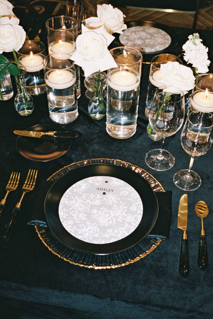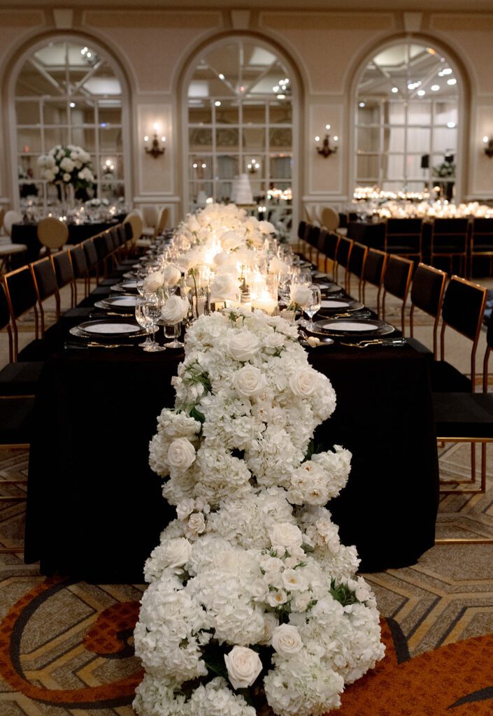 Their ceremony was nothing short of magical. White flowers were seen adorning the front of the altar and lining the aisle, creating a dreamy atmosphere. The reception continued the theme of refined luxury, with tables draped in dark linens, complemented by either black and gold or ivory and gold chairs. An abundance of white flowers cascaded off the edge of the tables, adding an opulent touch. Meanwhile warm candlelight flickered throughout the space, enhancing the romantic ambiance.