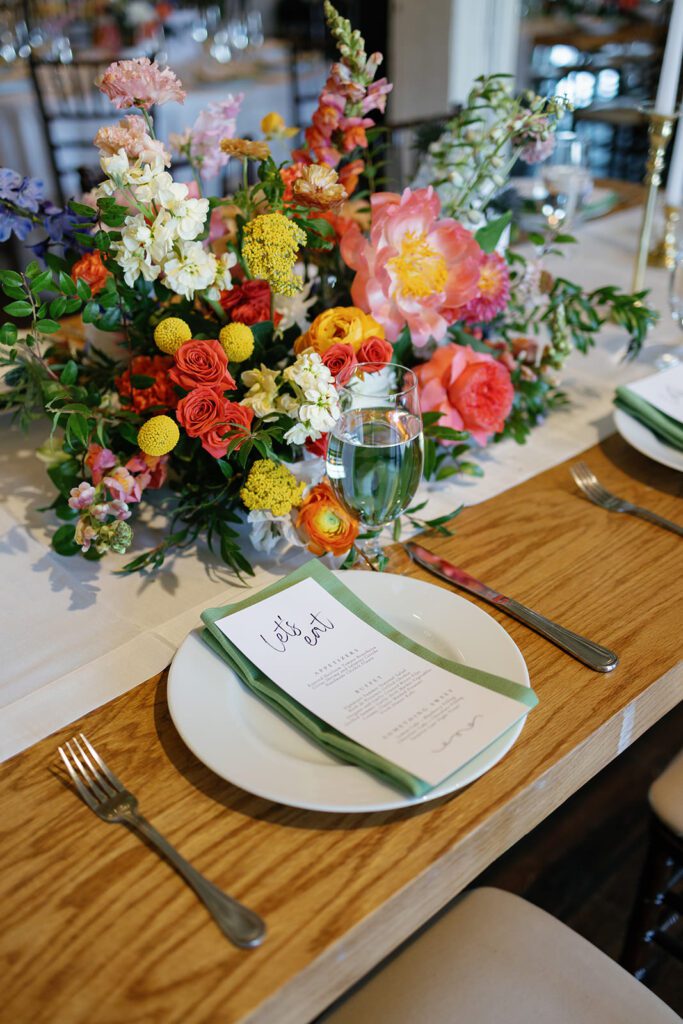 The reception transformed the vision into reality. Long wooden tables stretched across the room, lined with bold floral centerpieces and glowing candlelight. Each place setting felt elegant yet approachable, welcoming guests into a space filled with warmth.