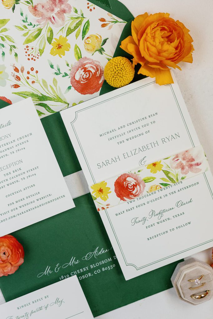 Every wedding story begins with the details, and this one set the tone right away. The invitation suite combined lush green tones with floral accents, immediately hinting at the vibrant design to come. From there, the bride’s accessories carried the same thoughtful energy — elegant shoes paired seamlessly with a bouquet overflowing with peonies, ranunculus, and roses in bold shades of pink, orange, and yellow.