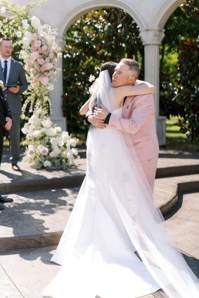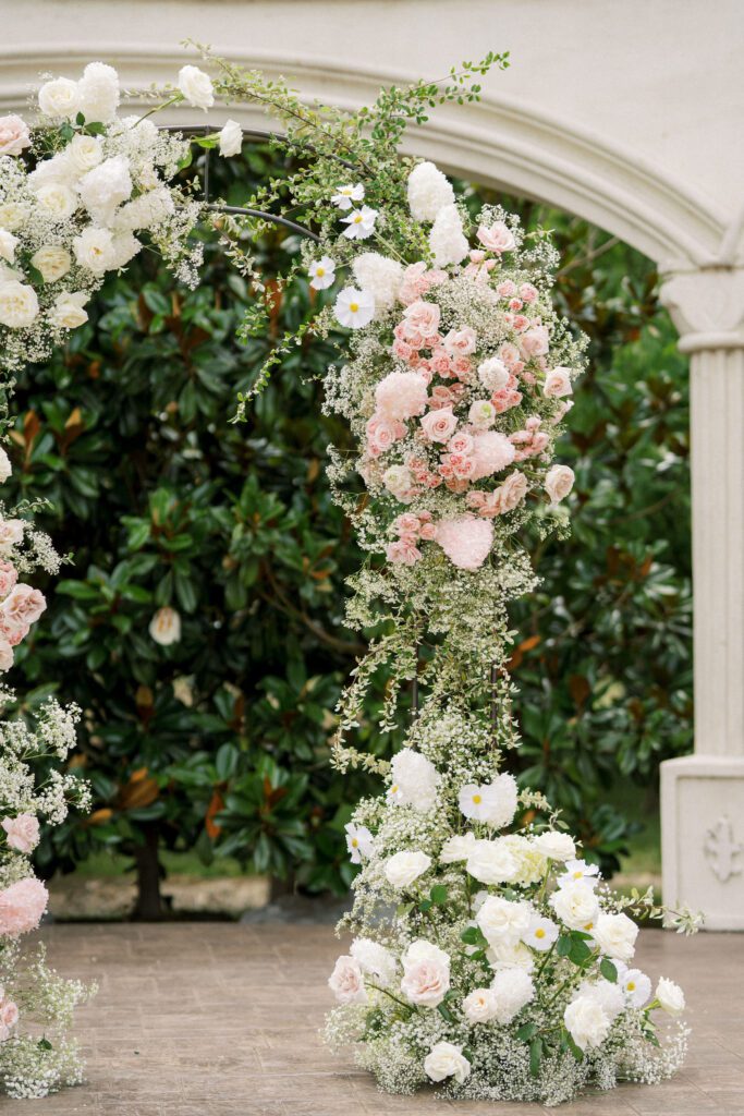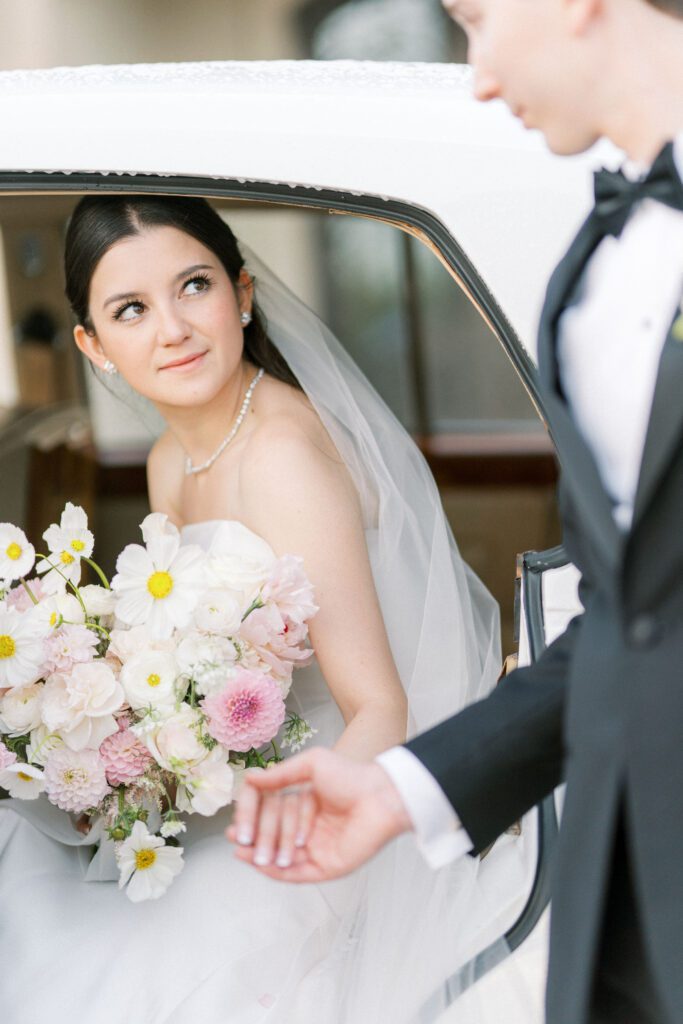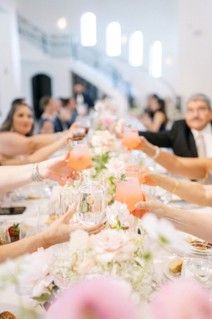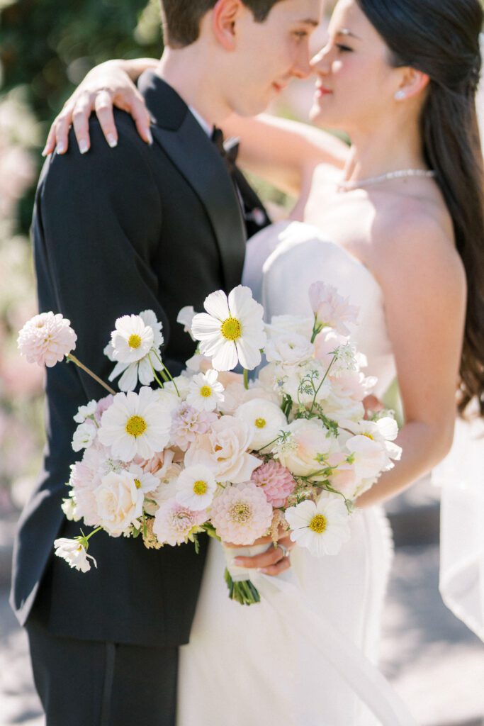 Cindy and Roberto envisioned a wedding that exuded classic sophistication, and we were thrilled to bring their dream to fruition. The color palette was a delicate dance of pink and peach tones. It was interwoven with lush greenery and pops of sunny yellow, most notably in the center of the daisies in Cindy’s stunning bridal bouquet.