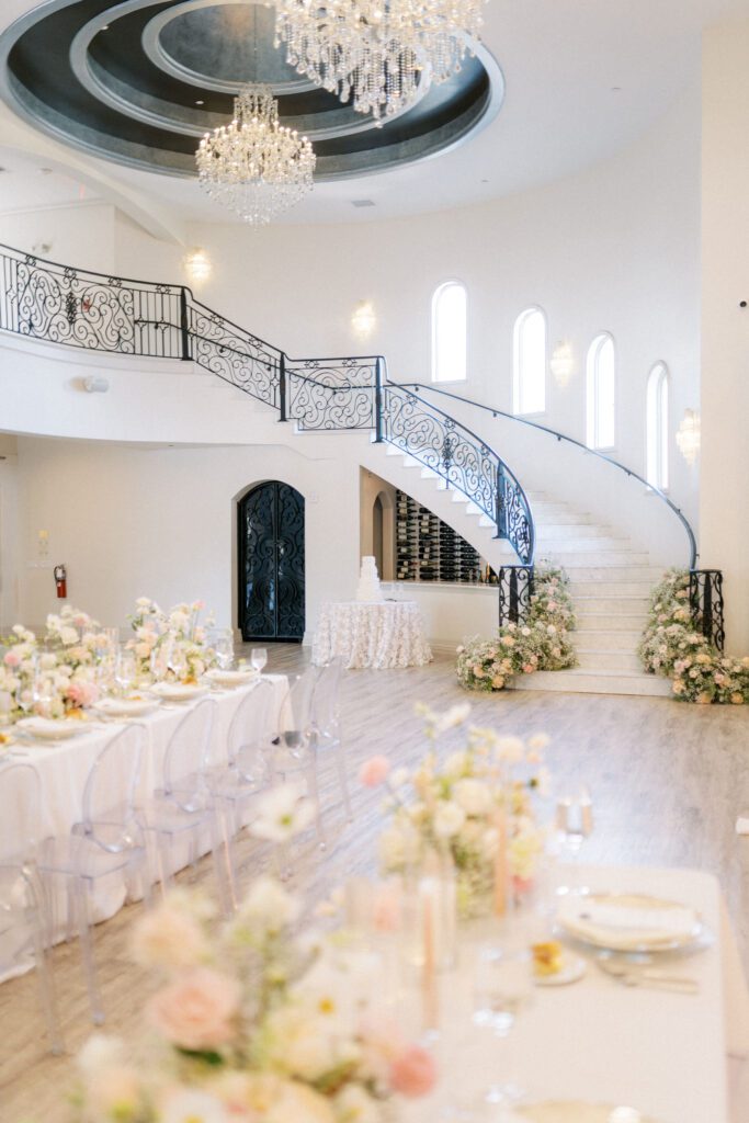 As the celebration transitioned indoors, the reception space radiated warmth and elegance. Ivory linens draped the tables, perfectly complementing the ghost chairs that had gracefully served during the ceremony. The floral arrangements, echoing the outdoor theme, adorned the tables. They even cascaded down a portion of the grand staircase, creating a visually stunning focal point.