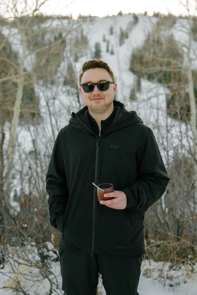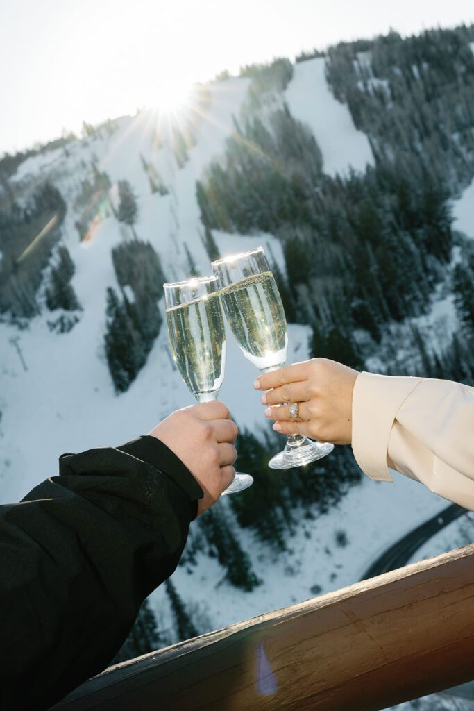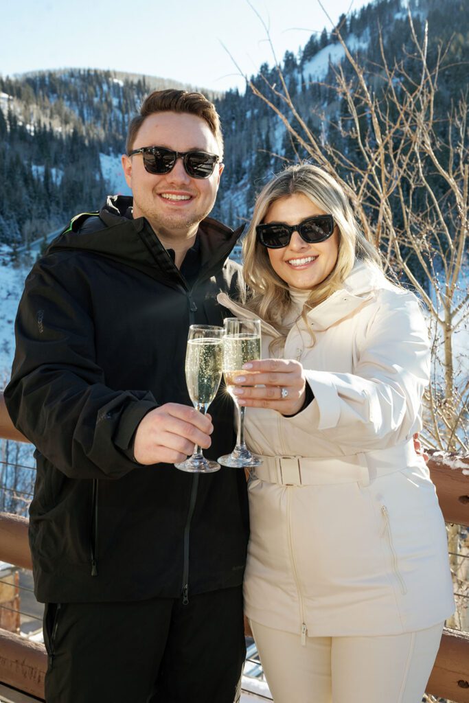 There’s something about après-ski that feels inherently celebratory. It’s the exhale after adventure, the pause before the next chapter. Brett and Austin’s session captured that feeling beautifully—champagne catching the light, cocktails warming gloved hands, and laughter echoing across the terrace.